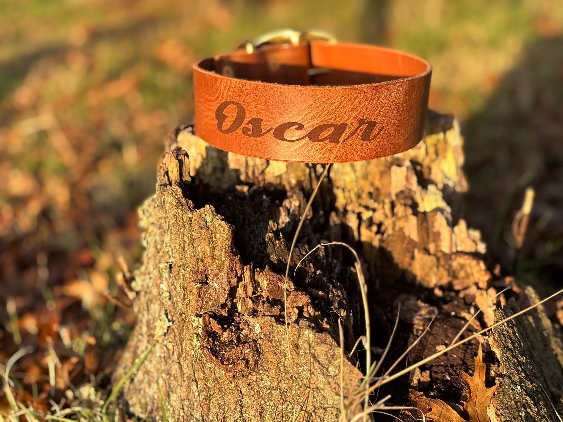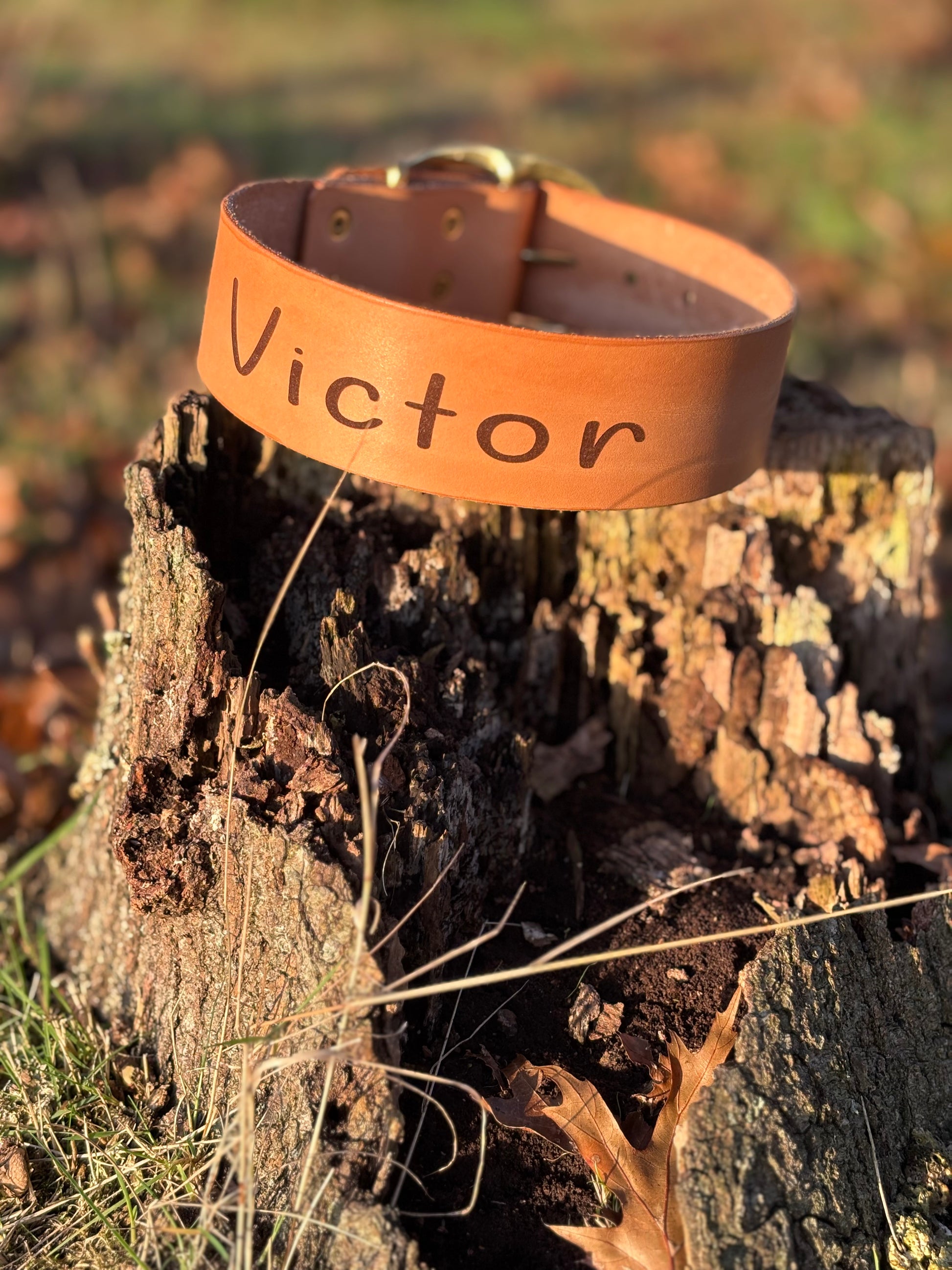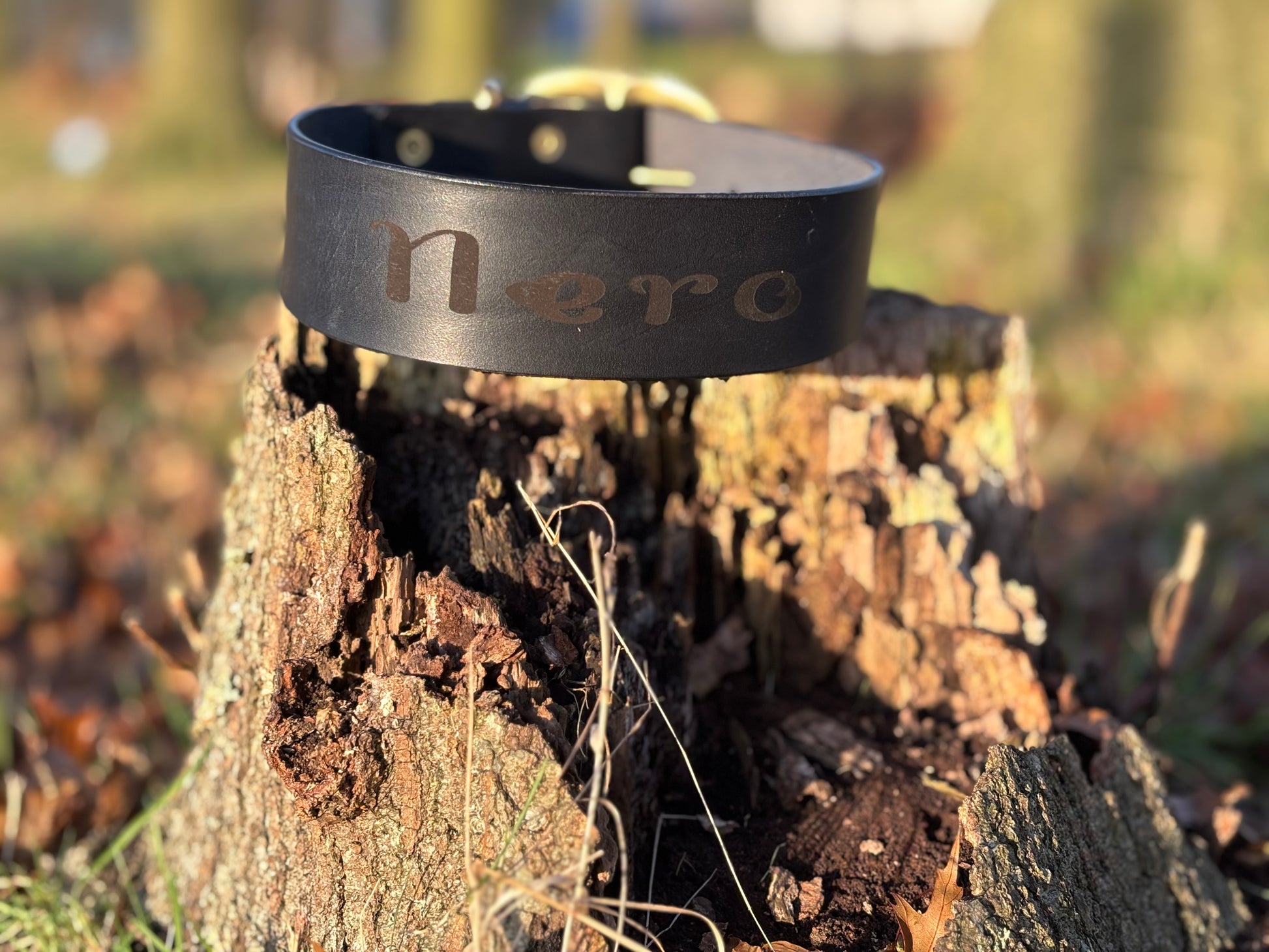 Laat jouw trouwe viervoeter stralen met onze exclusieve, handgemaakte leren halsband: de Halsband Gravura.