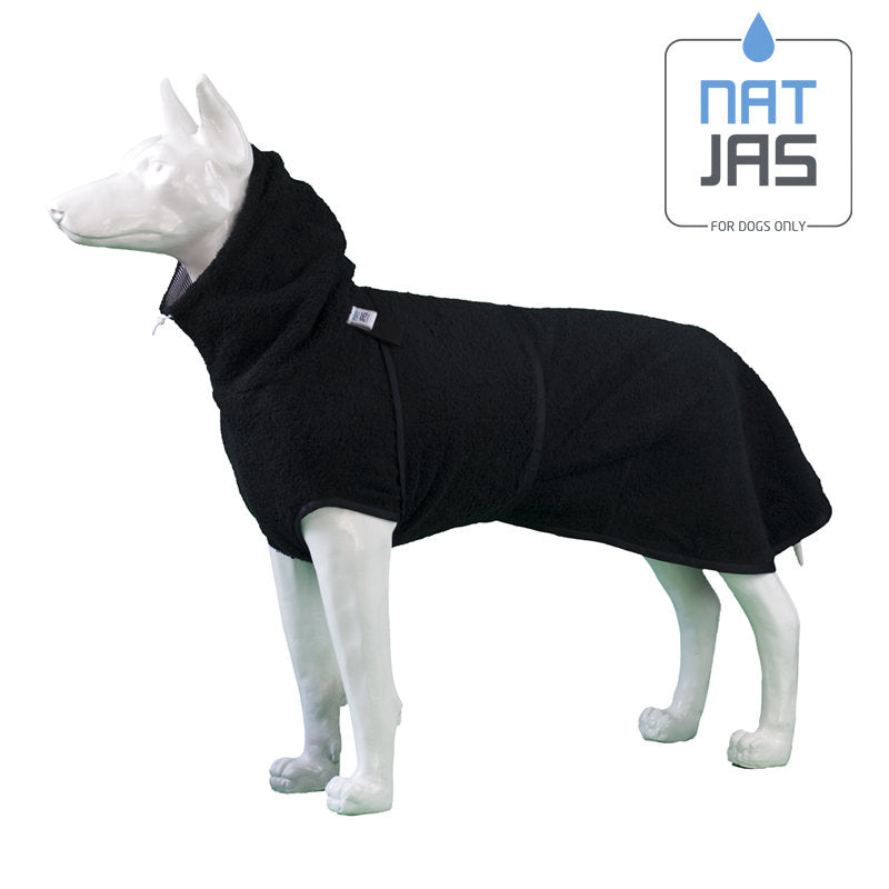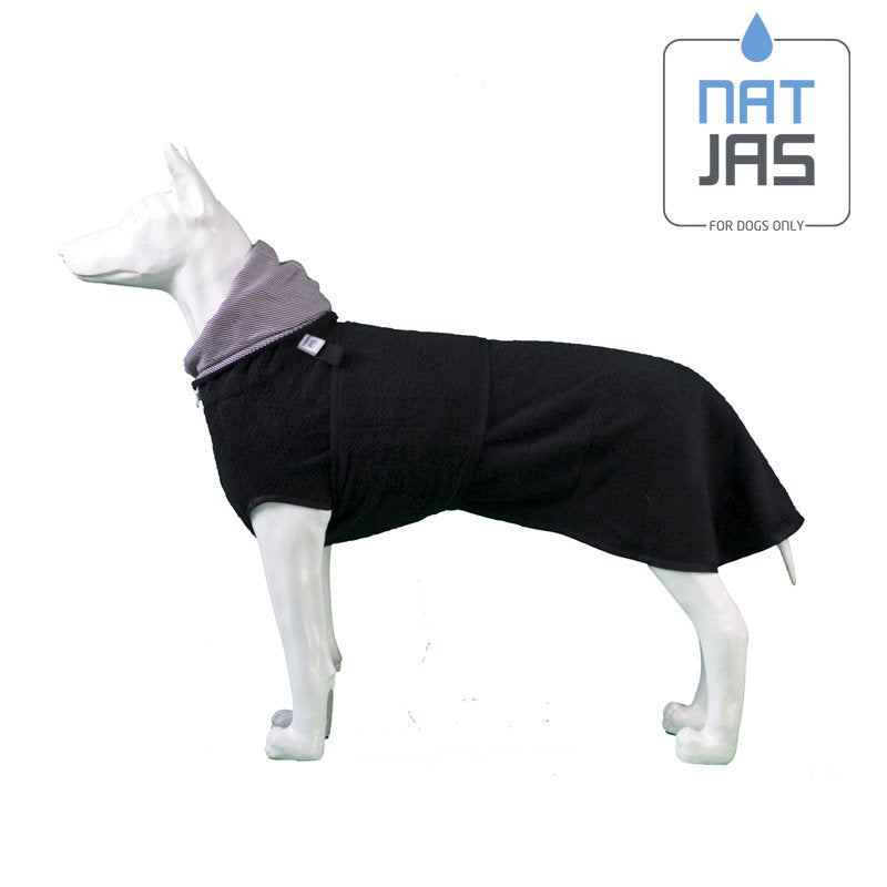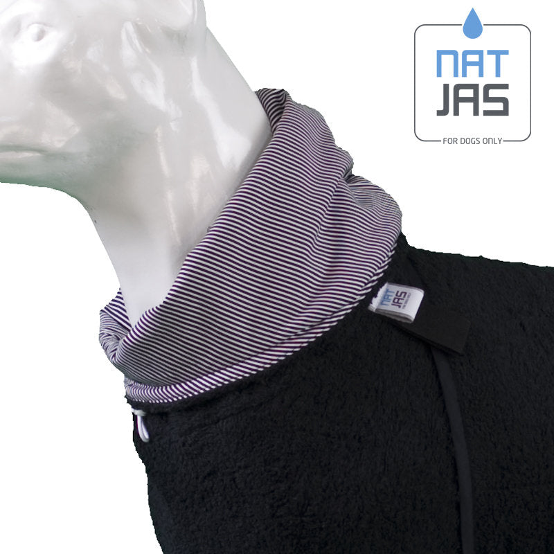 Deze badjas voor honden is gitzwart met subtiele, witte accenten. Less is more! We hebben ons bij deze hondenbadjas laten inspireren door onder andere Chanel, Gaastra en McGregor. Zo kan je hond na een zwempartij (of douche of bad) niet alleen comfortabel, maar ook stijlvol opdrogen in de auto of bijvoorbeeld op de boot. Bij kou of zelfs vorst, zorgt de Natjas er bovendien voor, dat je hond warmer blijft (wat natuurlijk beter is voor zijn spieren).