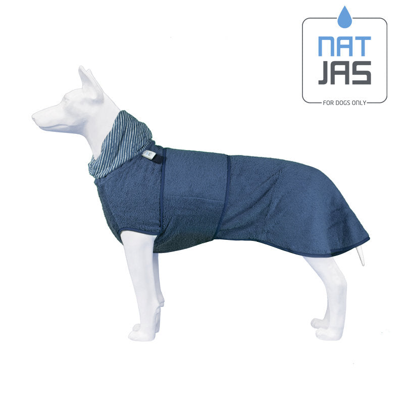 De Natjas Jeans heeft zoals zijn naam vast al doet vermoeden een jeansblauwe kleur. Het katoen heeft witte strepen, waardoor deze badjas een frisse uitstraling krijgt. De kleur staat bijvoorbeeld prachtig bij honden met een witte vacht. Wij zien deze hondenbadjas al helemaal shinen aan het strand!